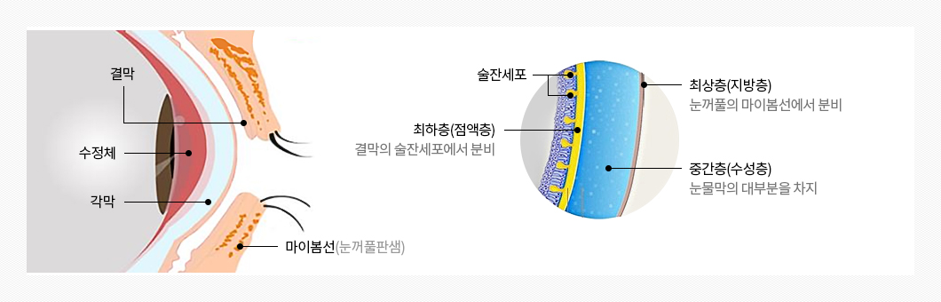 수분을 보호하는 지방성 기름막을 형성하여 눈물증발을 막아주는 역할을 합니다.