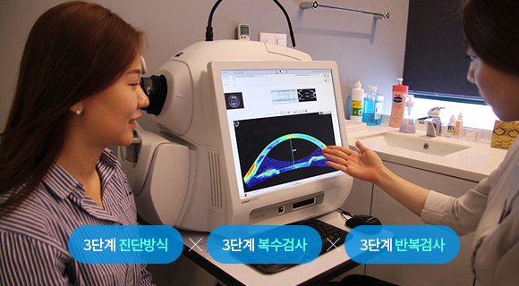철저한 50여가지 정밀검사 시스템 수술 결과를 정확하게 예측하기 위해 50여 가지 첨단 안전 검사를 실시하며 3+3+3검사시스템으로 다른 장비로 3번씩 검사하는 복수검사, 같은 검사를 3번씩 반복하는 반복검사를 시행해 수술의 안전성과 만족도를 높였습니다.