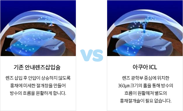 굿모닝백이안과의 아쿠아ICL은 렌즈 중앙에 작은 구멍이 있어 홍채절개술의 과정이 없이도