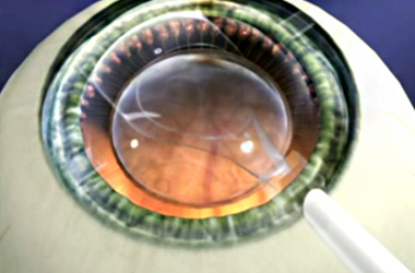 안내렌즈삽입술 1~2주 전 홍채 주변부에 0.8~1.0mm 정도의 작은 구명을 절개하여