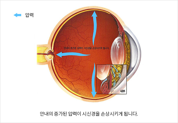 안압 상승 등의 원인으로 인해 손상되어 시신경에 장애가 생겨 시야 결손 및 시력 손상을 일으키는 질환입니다.